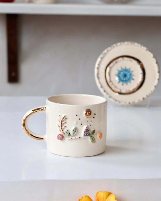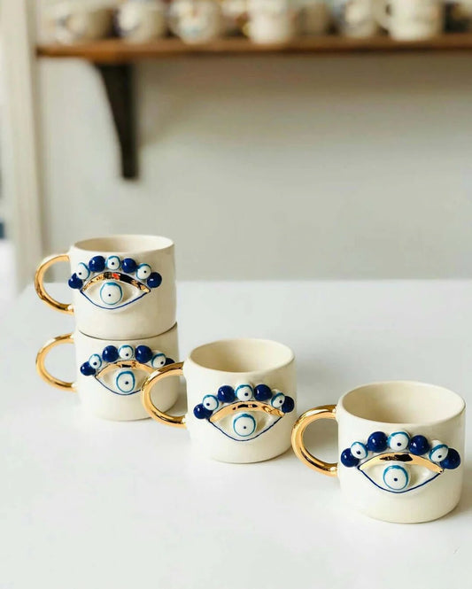 Handmade Evil Eye Ceramic Mug – Artisan Pottery with Gold Handle